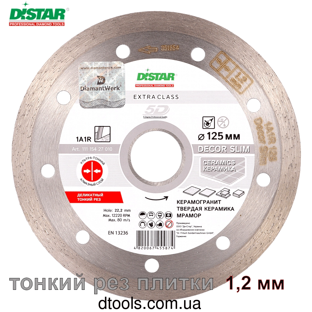 Distar Decor Slim с тонким алмазным слоем 1,2 мм дает возможность выполнять рез керамической плитки с минимальным сколообразованием, обладает высокой производительностью и долгим сроком службы. Применим так же и для резки мягких мраморов. Для достижения минимального (идеального) сколообразования при порезке керамогранита, гранита рекомендуем использовать приспособления slider насадка для болгарок 125 мм.